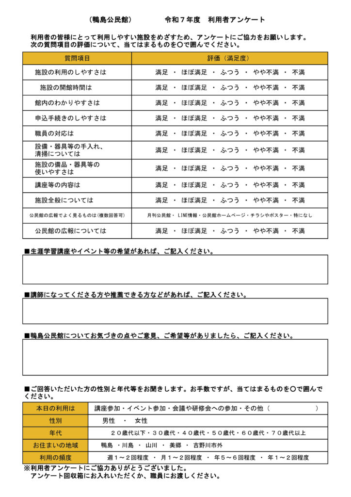 鴨島公民館では、これからの講座やイベント開催に向けて、皆さまがどのような感想やご意見を持っているのかをお伺いをするためにアンケートを実施しています。