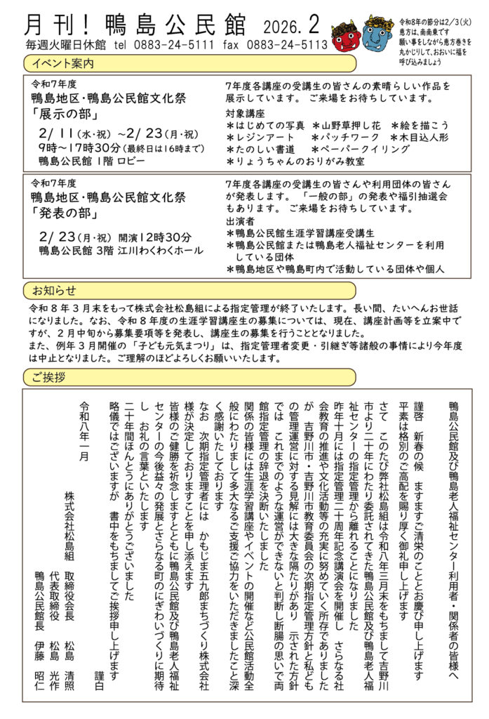 また、例年3月開催の「子ども元気まつり」は、指定管理者変更・引継ぎ等諸般の事情により今年度は中止となりました。ご理解のほどよろしくお願いいたします。