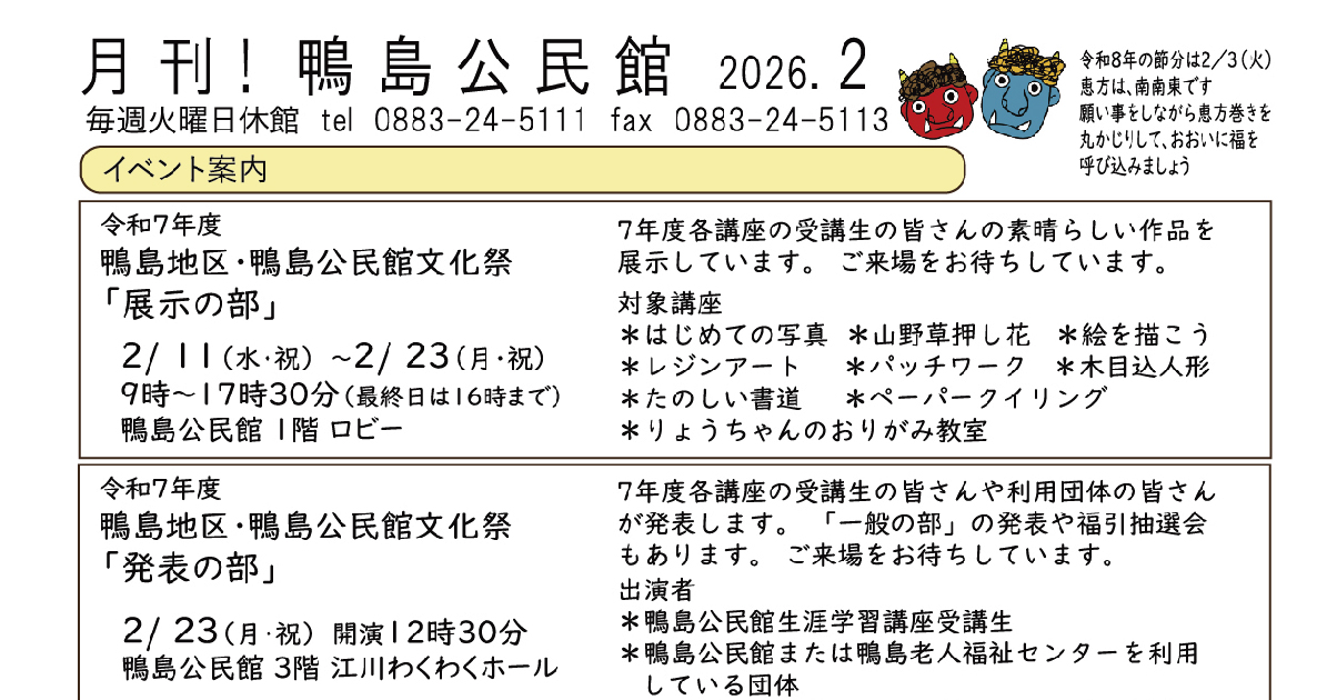 令和7年度「鴨島地区・鴨島公民館文化祭」を次のとおり開催いたします。今年度も鴨島地区の方や鴨島町内で活動している団体の出演者(一般の部)も募集し、生涯学習講座も含めて計19組の団体の方が発表いたします。